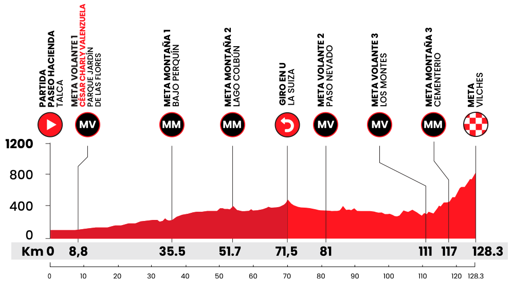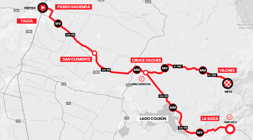 La cuarta etapa llevará la competencia a los exigentes caminos cordilleranos con un recorrido de 128,3 kilómetros en formato de montaña, partiendo a las 10:30 horas desde el sector Paseo Hacienda en Talca. La ruta avanzará rumbo a San Clemente para luego internarse hacia Vilches para finalizar la cuarta y Final de la #vmc 2026.